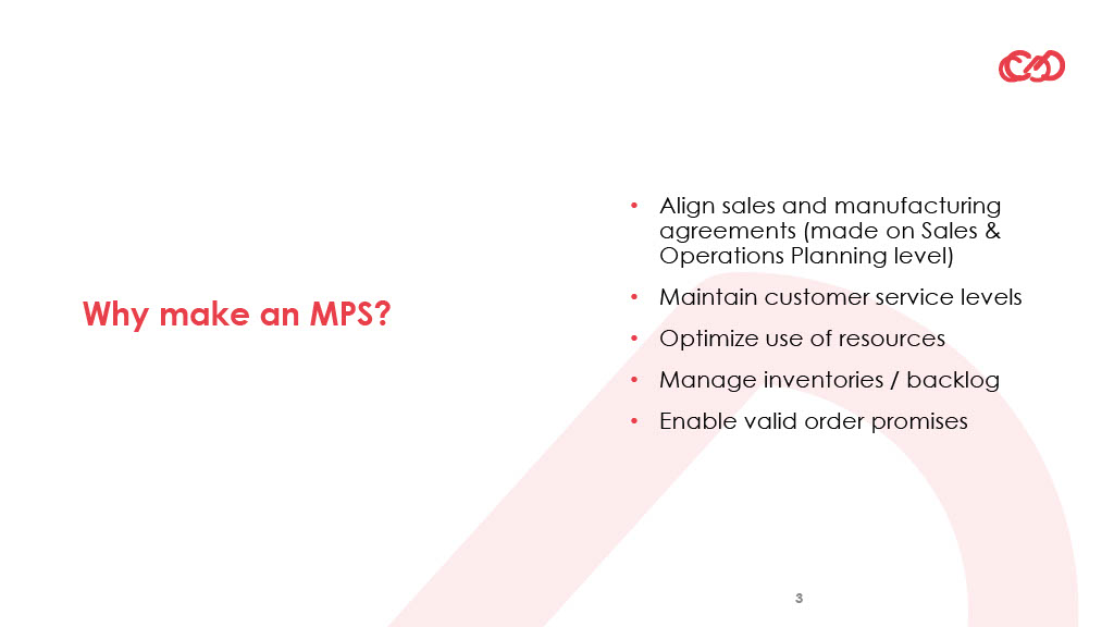 - Assure the agreements that are made between sales and manufacturing are reflected. These agreements are typically made in the production plan on S&OP (Sales & Operations Planning) level where agreements are typically made on family/month level (versus the item/week level on which we make an MPS). Of course, there can be reasons to deviate and then the MPS can drive those discussions by providing a clear analysis on the causes for the deviation and aligning with the stakeholders on the best way to respond.