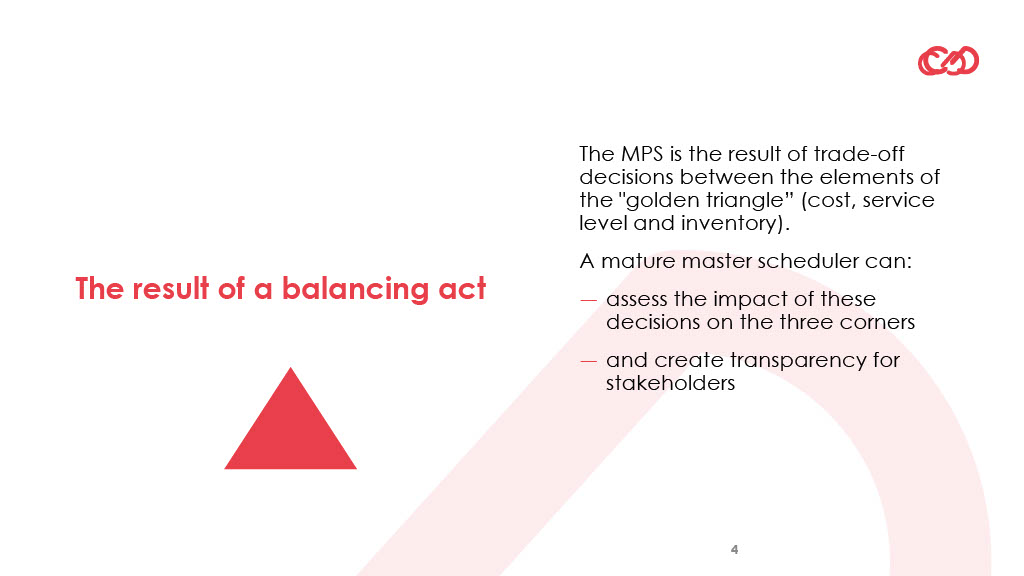 It means that a good master production schedule is the result of well-thought-through choices. Those choices are a result of a balancing act, between the key elements of the golden triangle (cost, service level and inventory). It requires analysis, evaluation and decision-making.