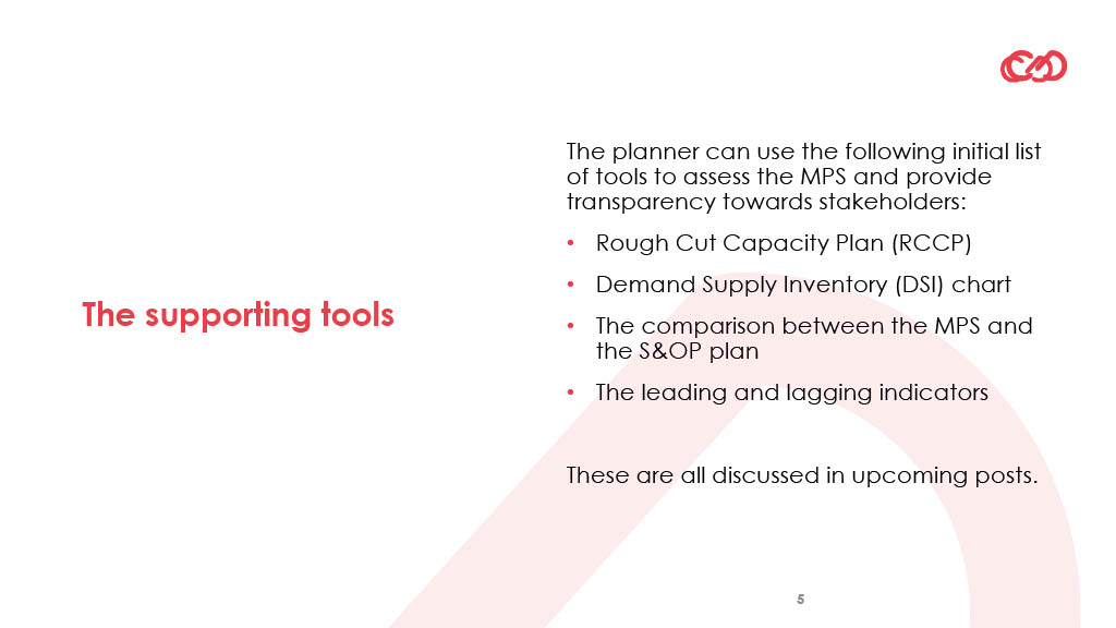 The different supporting tools allow the master production schedule to do this full assessment of the different elements in a systematic, disciplined and rational way. It would allow him to gather insights, and the planner can also use these tools to provide transparency towards the stakeholders.